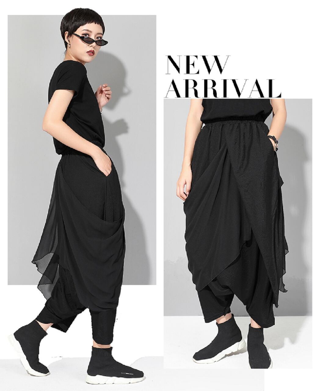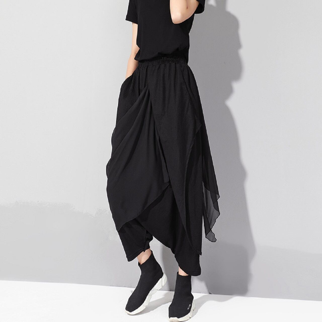秋 夏 レディースパンツ アシンメトリー ステッチ ティアードパンツ シフォン キュロット 薄手 9分丈パンツ ドロップズボン ハーレムパンツ ブラック 個性的 スタイリッシュ おしゃれ 大人女子 履きやすい ヤセ見え 体型カバー 細見え ドレープ M L XL ストリートパンツ ナチュラルウェスト プリーツ バギーパンツ