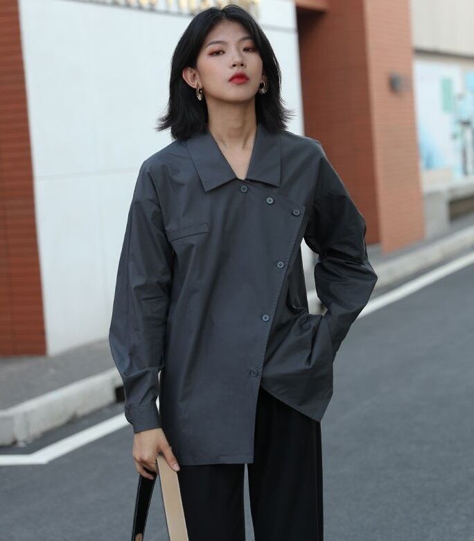 高級シャツ レディース ニッチ レトロ 香港スタイル 長袖 秋 冬 ホットスタイル ダークグレー S M L 変形身頃 ボタン メンズライク 無地 ポロカラー 通勤 通学 ストレートシルエット マニッシュ 細見え 着やせ効果
