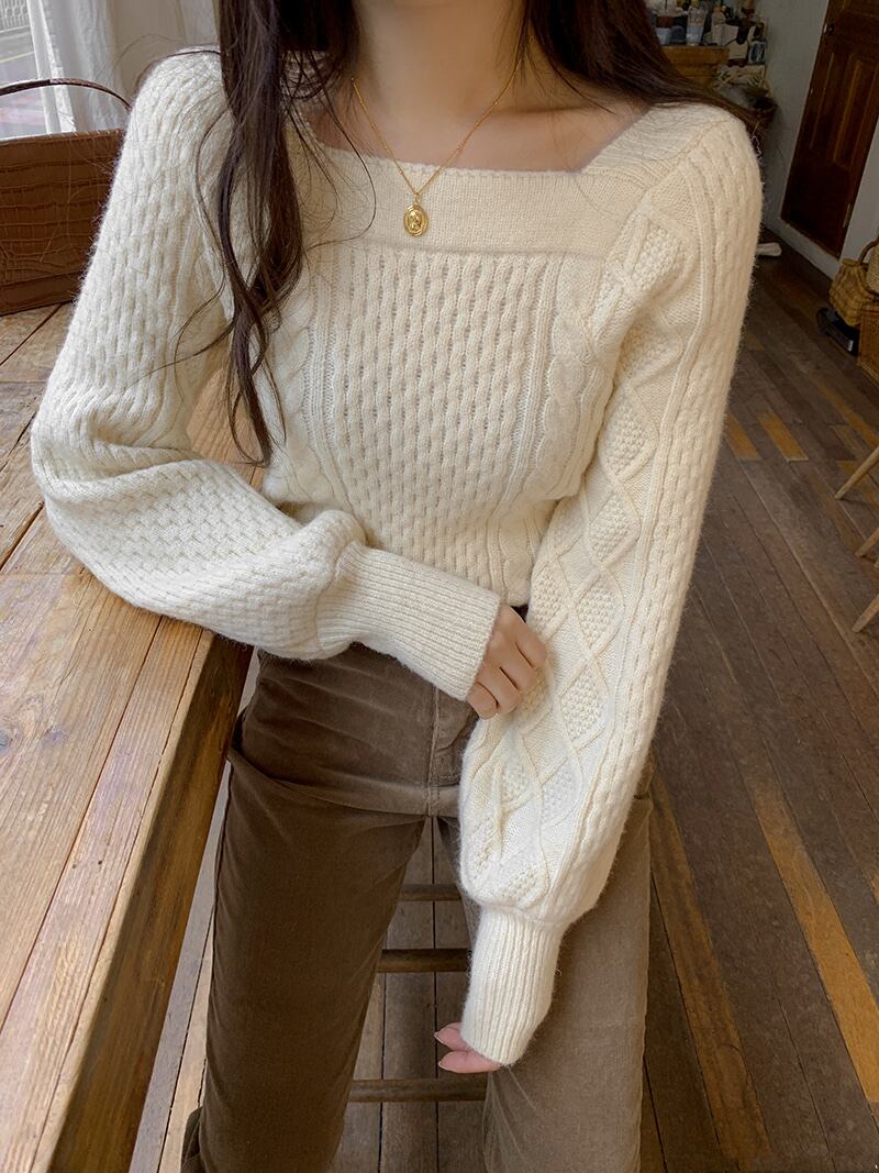 ケーブル編みとスクエアネックが可愛らしいニットトップス。