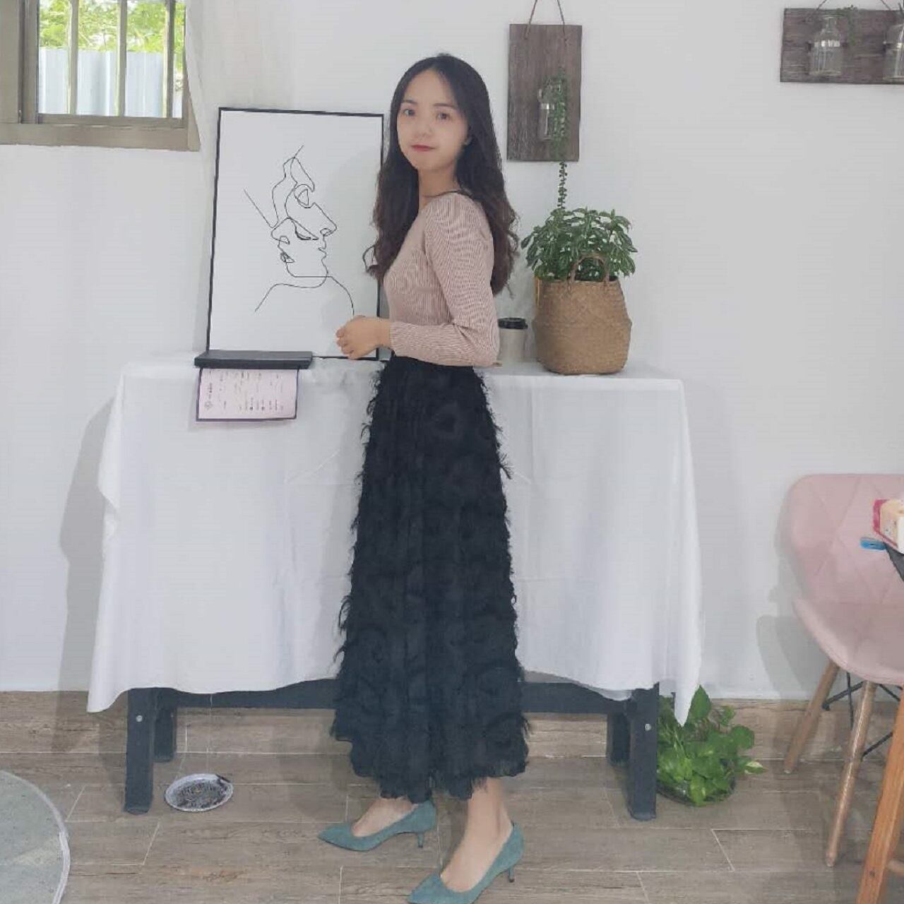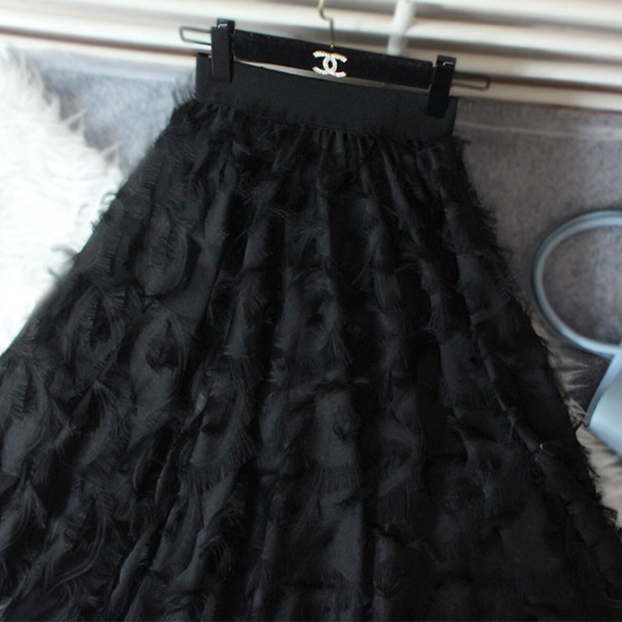 新作 タッセルフェザー ロングスカート 秋 ビッグフレアスカート ブラック オールマッチ 孔雀羽 フリンジ ハイウェスト ウェストゴム S M L XL レディーススカート フェアリー ブラック S M L XL レース生地 Aラインスカート きれい目 エレガント 大人女子 おしゃれ おでかけ デート カジュアル 透け感 ゆとり 細見え 上品 体型カバー