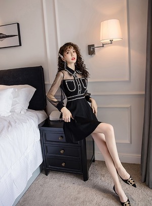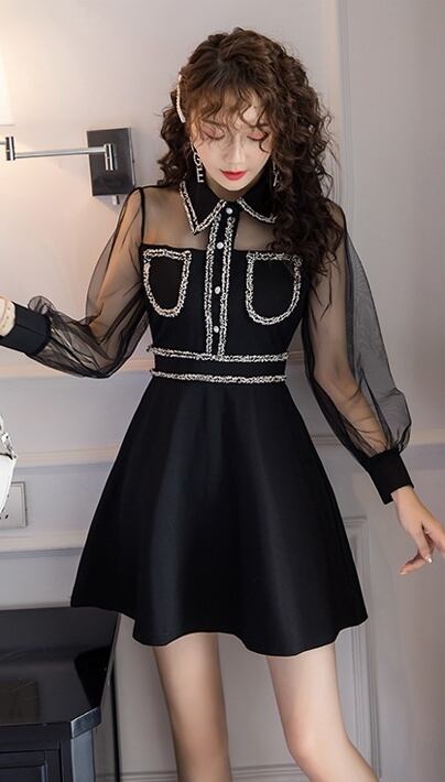 新作 レディース ワンピース ミニ ミニ丈 長袖 襟付き Aライン レース 透け感 シースルー かわいい 大人可愛い キュート ガーリー 無地 春 秋 10代 20代 レディース 女性用 お出かけ 韓国 S M L XL 2XL 黒 ブラック