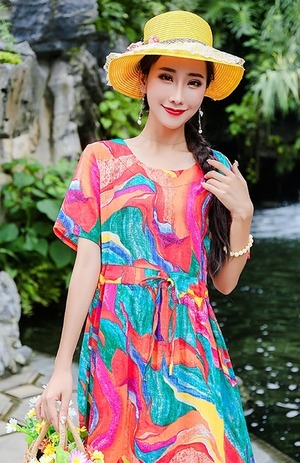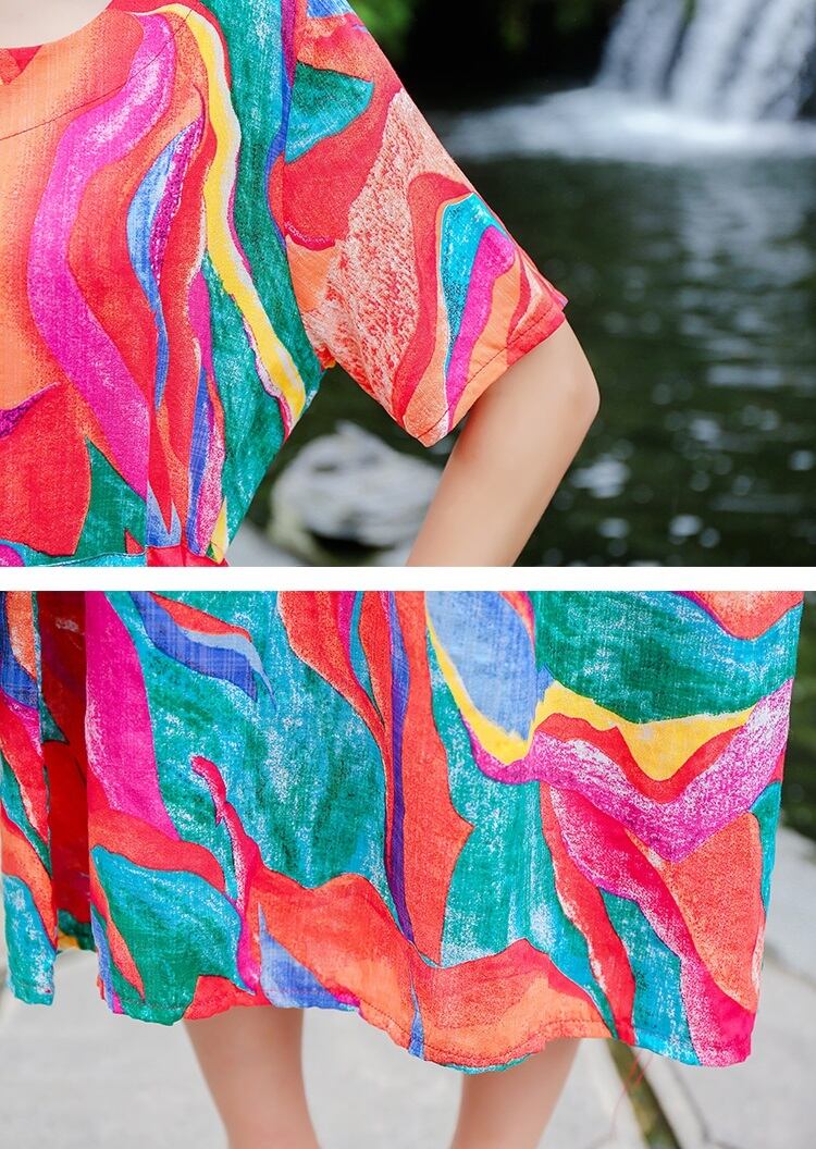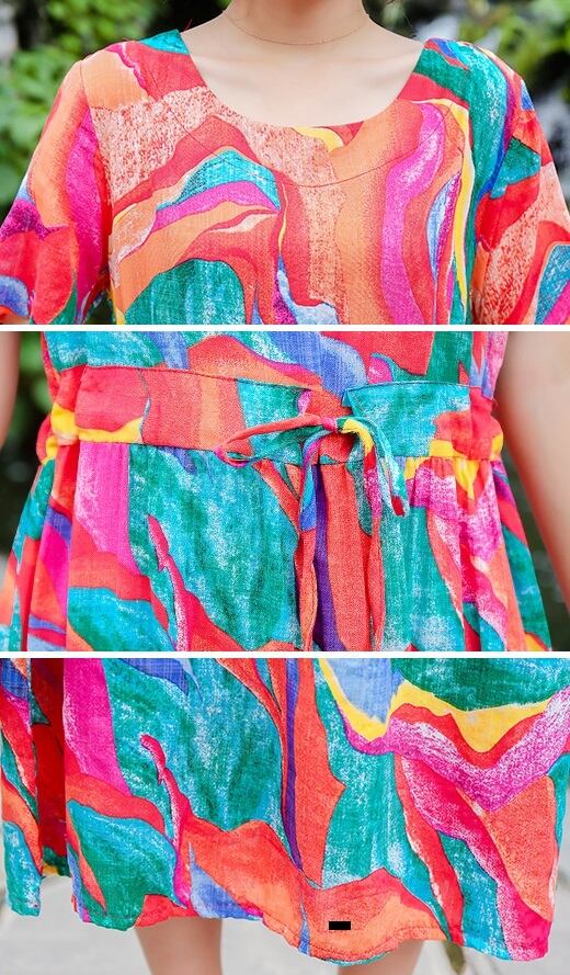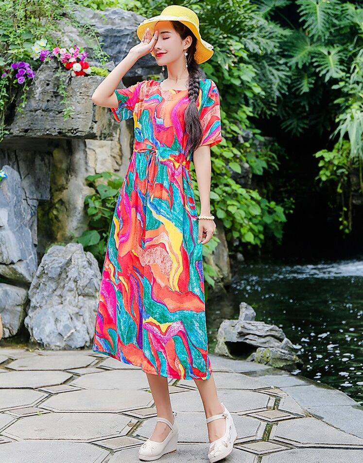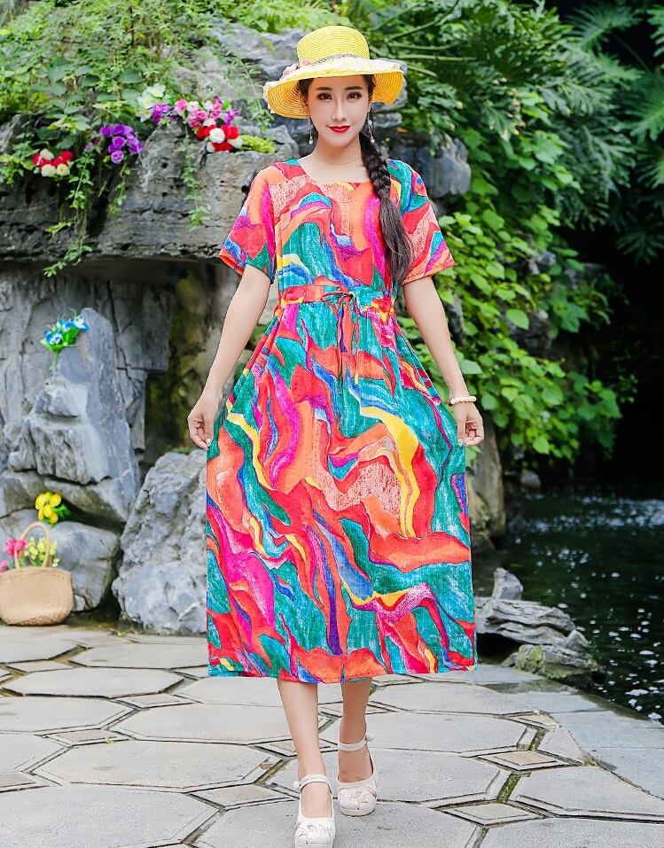 新作 夏 エスニックワンピース レディース ドロスト 半袖 ラウンドネック プルオーバー ミドル丈 バカンス リゾート 旅行 南国 海 休日 ポケット 伸縮ウェスト Aラインスカート プリント模様 明るい きれいめ おしゃれ 体型カバー マルチ模様 M L XL 2XL 華奢見え 細見え ヤセ見え サマ見え こなれ感 スッキリ見え エレガント デート カジュアル 大人かわいい 大人女子 20代 30代 40代 フレア ビッグサイズ プラスサイズ ルーズ ラージサイズ 目立つ スタイルアップ レトロドレス