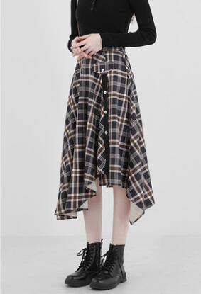 秋 冬 格子縞スカート 不規則 長スカート ビッグフレア アシンメトリーアンバランス ウェストゴム サイドジッパー ポケット ミドル丈 チェック柄 ハイウエスト レディース 好印象 フェミニン 20代 30代 通勤 通学 OL 学生 カジュアルエレガント スッキリ見え 華奢見え こなれ感 サマ見え おしゃれ 若見え 足長効果 美脚効果 コーヒー ブラック S M L XL カッコイイ スタイリッシュ