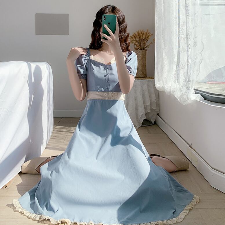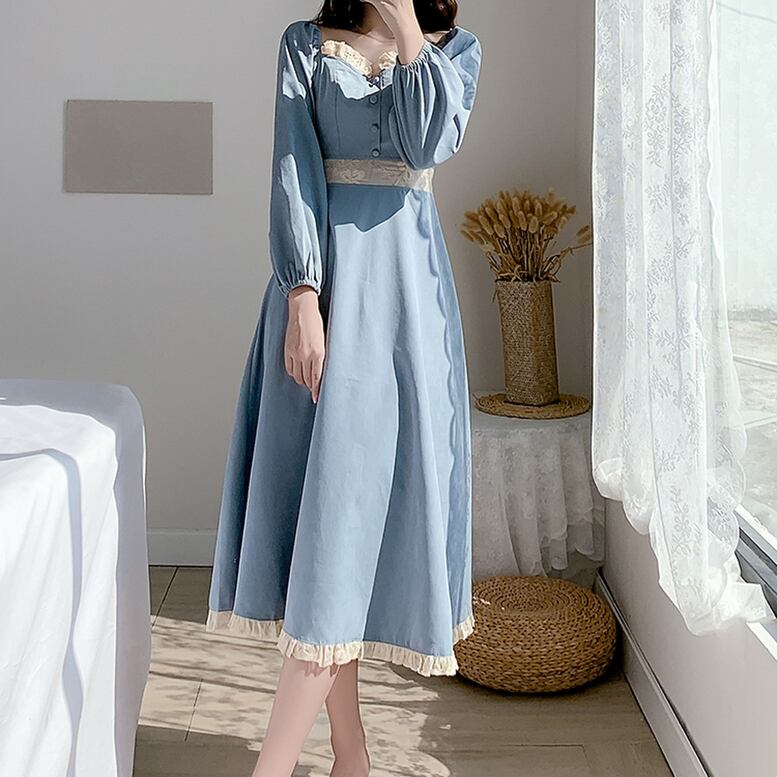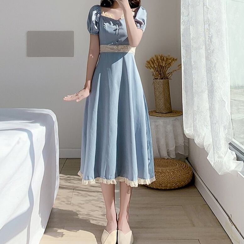 ワンピース レディース ロングワンピース ボリュームスリーブ フリル レース ハイウエスト スクエアネック 長袖 半袖 選べる フレア ドレス ひざ下丈 ブルー パーティドレス 大人可愛い きれいめ 上品 レトロ ガーリー エレガント フォーマル 春 夏 秋 冬 二次会 オフィス ビジネス OL 通勤 学生 通学 デート お出かけ パーティー 女子会 体型カバー ゆったり ニュアンスカラー