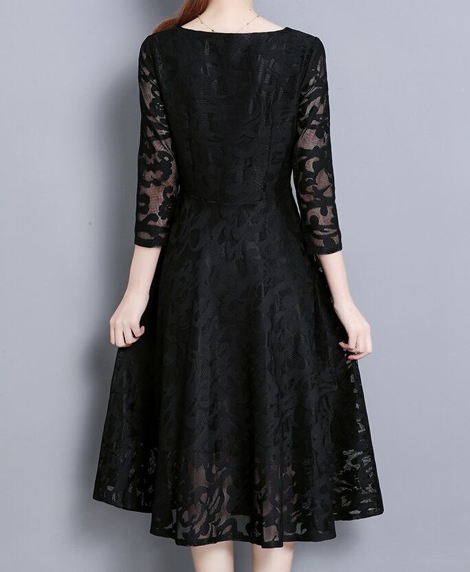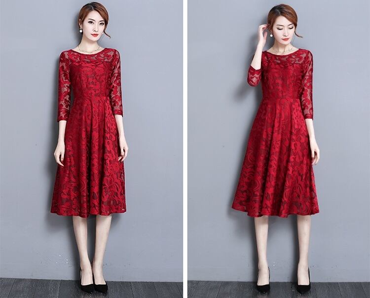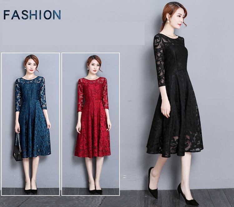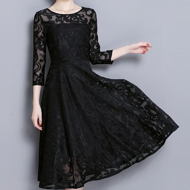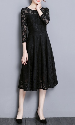 レースワンピース ラウンドネック 7分袖 フレアスカート ミドル丈 透け感 シアー感 ハイエンド 高級感 ハイウェスト 結婚式 成人式 パーティー おしゃれ ホテル エレガント 上品 好印象 大人女性 映えItem 存在感 華やか 華奢見え 細見え ヤセ見え サマ見え こなれ感 スッキリ見え フォーマル きれいめ シック おしゃれドレス スタイルアップ M~5XL ビッグサイズ ネイビー レッド ブラック
