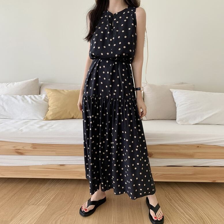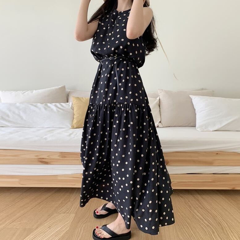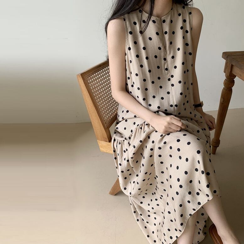 ワンピース レディース ドット柄ワンピース ジップネック ロング ドレス ティアード ノースリーブ キーネック 水玉 プリント マキシ 袖なし カーキ ブラック 黒 パーティドレス 大人可愛い きれいめ 上品 レトロ ガーリー エレガント フォーマル 春 夏 秋 冬 二次会 オフィス OL 通勤 学生 通学 デート お出かけ パーティー 女子会 イベント 体型カバー 普段使い ゆったり インスタ映え ニュアンスカラー