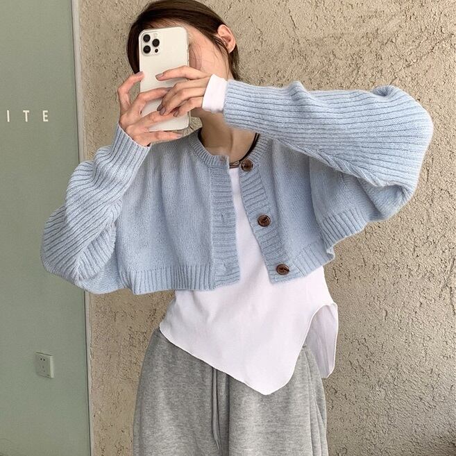 ニットカーディガンアウターボレロトップス カジュアル 通勤 通学 ショート丈 バットスリーブ シングルブレスト ボタン 韓国 羽織物 春 長袖 レディース 休日 旅行 オフィスコーデ エレガント 20代 30代 体型カバー スタイリッシュ かわいい キュート 好印象 スタイルUP 細見え 大人可愛い きれいめ おしゃれ こなれ感 体型カバー 華奢見え 細見え ヤセ見え サマ見え こなれ感 スッキリ見え ワンサイズ ライトブルー