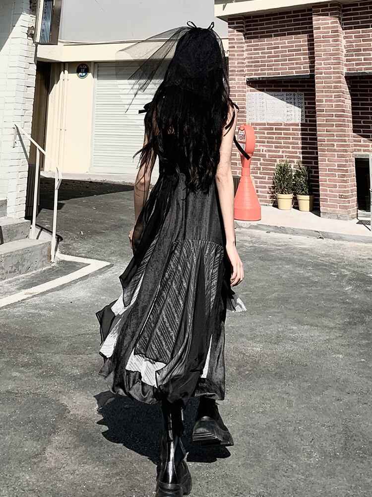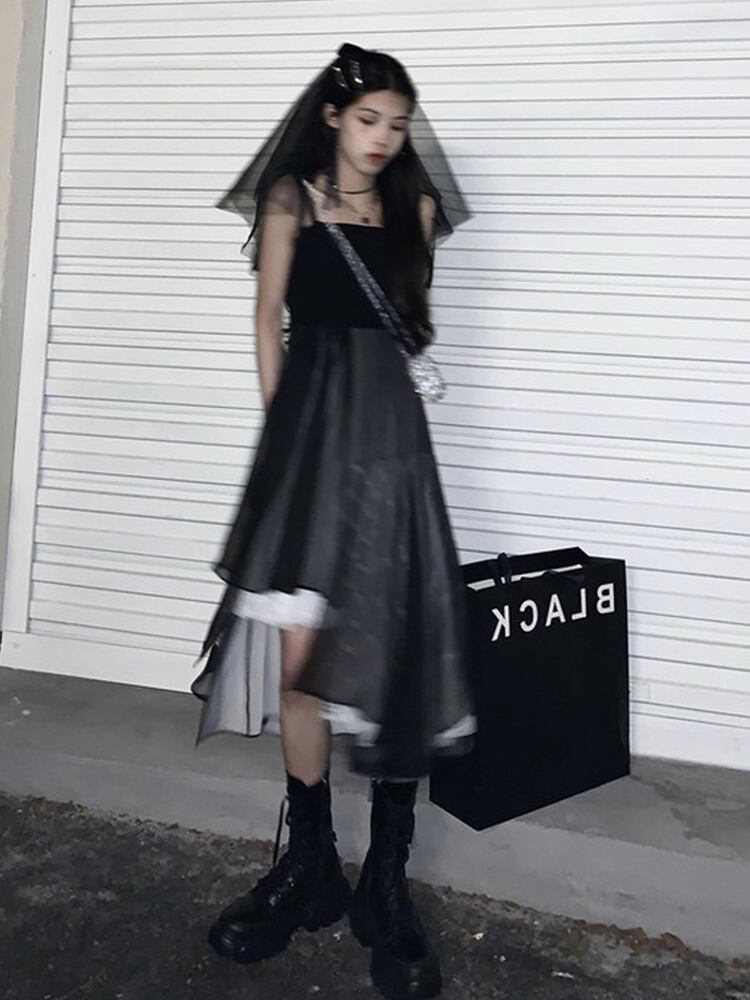 ワンピース レディース キャミワンピース オールインワン ジャンパースカート 膝丈 ひざ丈 膝下 ミディ丈 ノースリーブ 総柄 ハイウエスト トレンド ひらひら 肩ひも調整可能 Aライン ゆったり 大きいサイズ 裾アシメ 小さいサイズ フレア 体型カバー アシンメトリー 着痩せ 切り替え シースルー 透け感 スタイリッシュ おしゃれ モード系 大人可愛い カジュアル 韓国 個性的 春 夏 秋 お出かけ 普段着 普段使い 着回し イベント 衣装 黒 ブラック 10代 20代 30代 XS S M L XL
