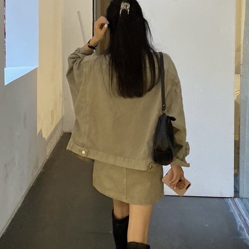 デニムジャケット ハーフ丈コート ショート丈スカート ツーピース オシャレ 2枚セット ファッショナブル カジュアル セットアップ ボタン ポケット 新作 春 秋 香港風 長袖 通勤 通学 学生 OL オフィスコーデ レディース リラックス カジュアル ラフ スポーツ オフコーデ 韓国 クール 秋 10代 20代 おでかけ 細見え きれいめ おしゃれ 足長効果 華奢見え ヤセ見え サマ見え こなれ感 モテコーデ スッキリ見え S M ベージュ カーキ