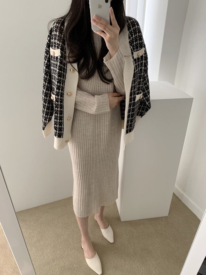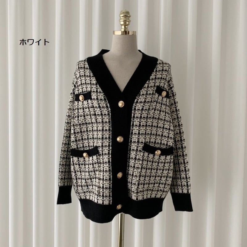 ニットカーディガン 長袖 シングルジャケット ラインボタン コート チェック柄 格子柄 Vネック ゴールドボタン 飾りポケット 羽織物 ミドル丈 シック レトロ 上品 大人女性 セミフォーマル ゆったり レディース 秋 冬 好印象 韓国 オシャレ ファッショナブル 通勤 通学 学生 OL 30代 20代 10代 おでかけ スタイリッシュ 細見え おしゃれ 体型カバー 着やすい スタイルUP 華奢見え ヤセ見え サマ見え こなれ感 スッキリ見え フリーサイズ ブラック ホワイト