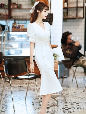 Vネックでエレガントな雰囲気のマーメイドラインのドレスです