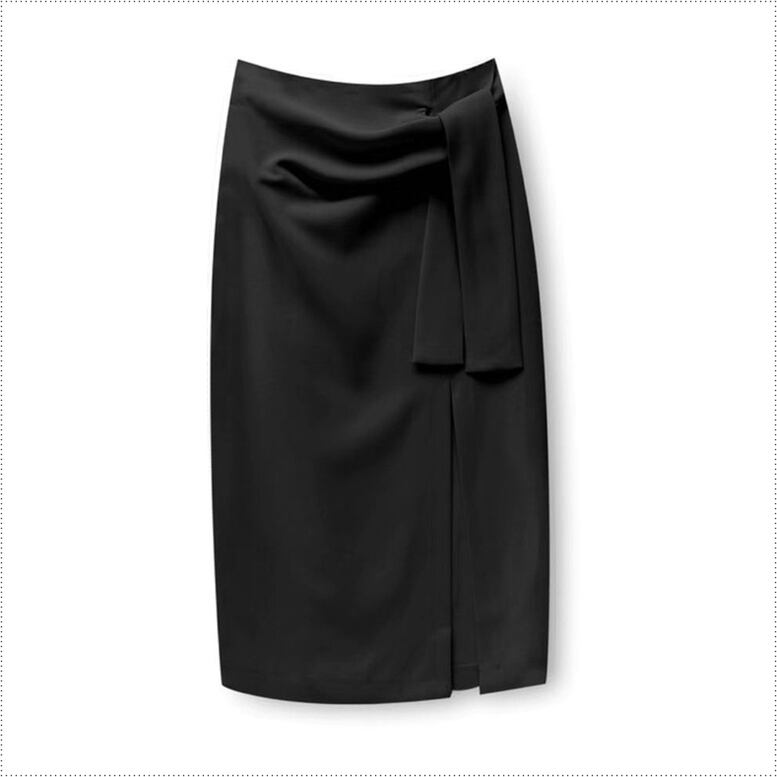 リボンを結んだウエストのギャザーやスリットの縦ラインが美脚に見せてくれてスタイルアップを叶えます