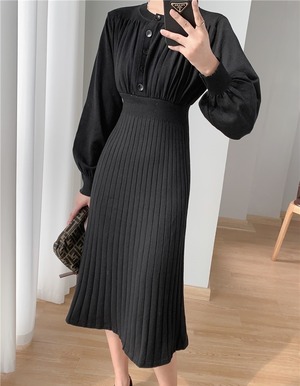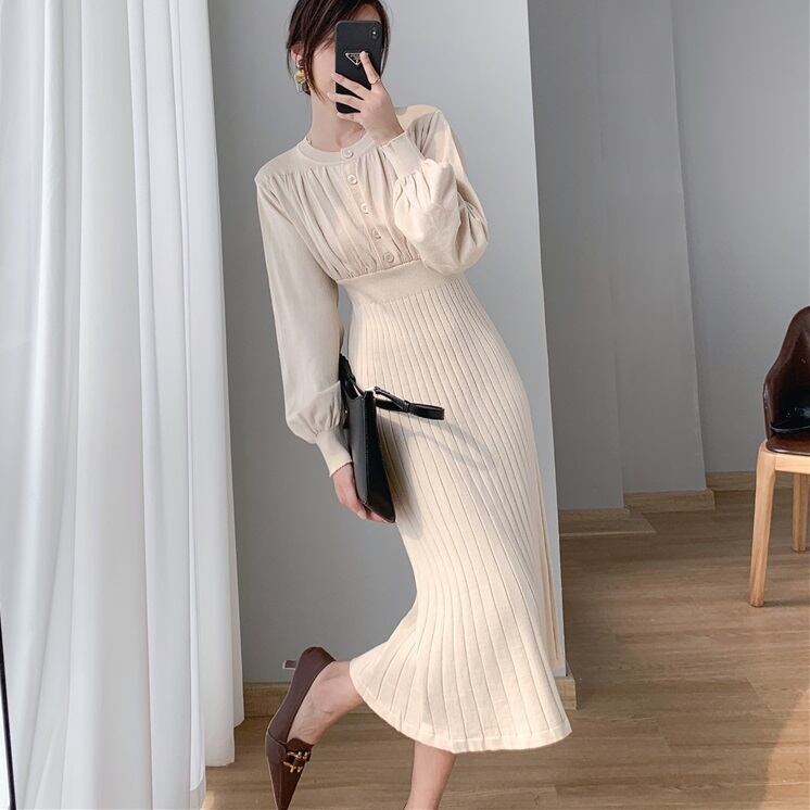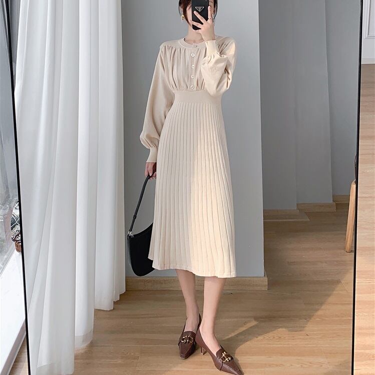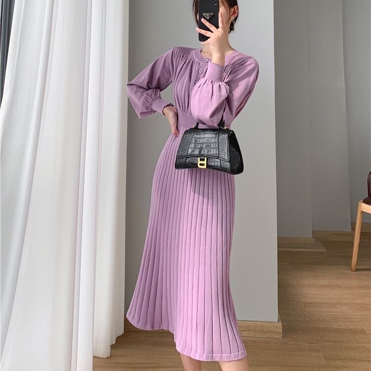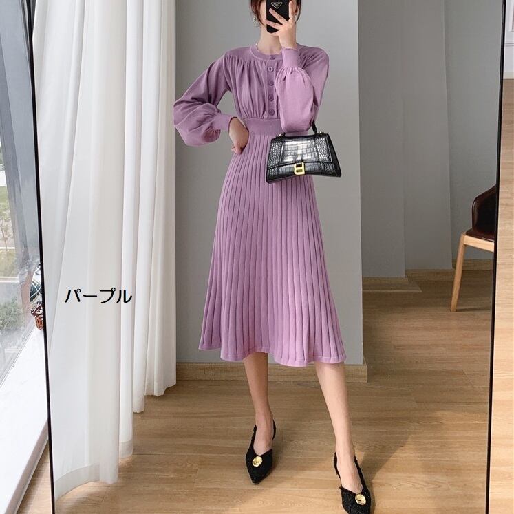 ランタンスリーブ ニットドレス ワンピース 長袖 大人女子 ハイウェスト ニット レディース 秋 冬 プリーツ ボタン シングルブレスト 伸縮性ウェスト ゆったり ラウンドカラー Aライン フォーマル ミドルロング丈 フレア エレガント 好印象 おしゃれ 韓国 通勤 通学 学生 OL 体型カバー 体型カバー エイジレス スタイルUP サマ見え こなれ感 着やすい 細見え 華奢見え ヤセ見え 大人女子 スッキリ見え S M L XL パープル アプリコット ブラック