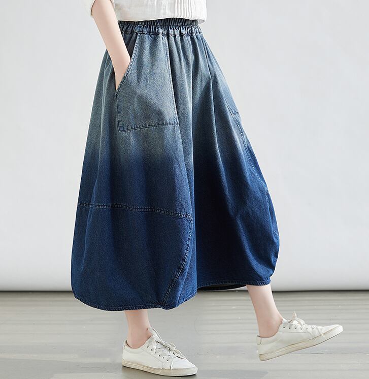 スカート ボトムス レディース フレアスカート デニムスカート ミモレ ミモレ丈 ロング ロング丈 ミディアム丈 半端丈 フレア Aライン ポケット ウエストゴム デニム かわいい 大人可愛い カジュアル 大人 おしゃれ お洒落 かっこいい 大人女子 ラフ メンズライク ボーイッシュ ルーズ アメリカン ビンテージ ヴィンテージ M L XL 2XL ゆったり ゆる グラデーション 青 ブルー 色落ち 無地 春 夏 秋 冬 オールシーズン 10代 20代 30代 女性用 お出かけ 休日 楽ちん