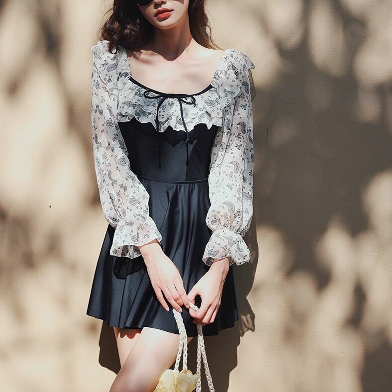 ワンピース水着 ボクサーパンツ フリル ブラウス キャンディースリーブ カジュアル水着 リゾート水着 ドレススタイル 体型カバー 薄い 長袖 ペイズリー柄 リボン 新作 セレブリティ レーシー 透け感 シアー感 フェアリー ガーリー 日焼け防止 フェミニン エレガント かわいい 海辺 妖精 休暇 ビーチ リゾート 旅行 観光 避暑地 バケーション 休日 レディース おしゃれ 上品 細見え スタイルUP 華奢見え ヤセ見え スッキリ見え 足長効果 足長見え 美スタイル M L XL XXL ブラック