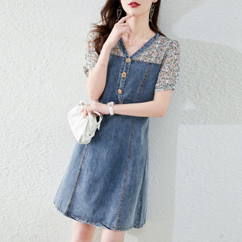 ワンピース レディース デニムワンピース ドッキングデニムワンピース ミニワンピース ドッキングワンピース Vネック 半袖 小花柄 切り替え ショート丈 デニム ブルー ハリ感 オシャレ シアー シンプル きちんと感 可愛い キレイめ 上品 フェミニン 春 夏 秋 冬 デイリー おでかけ 普段着 コンパクト スマート 細見え スタイルアップ 高見え 上級者 主役級 鮮度アップ 美脚見え ゆったり 体型カバー インスタ映え トレンド