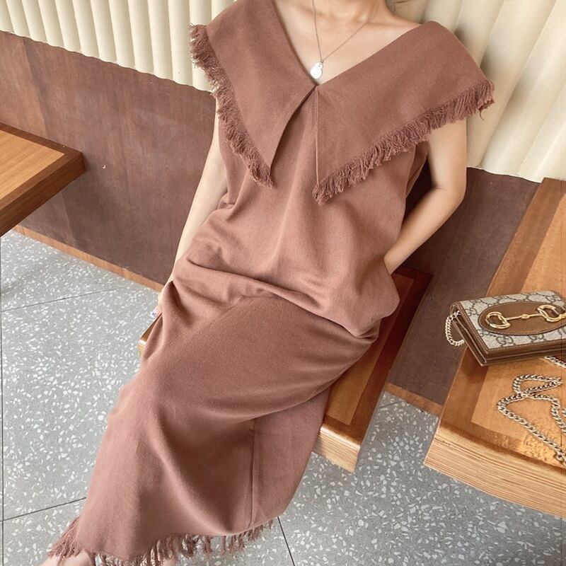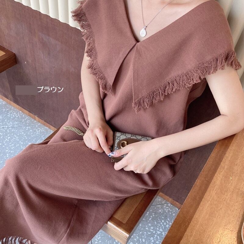 フリンジやタッセルが個性的で、オシャレアイテムとしてはもちろん、多用途に使えるデザインがポイントです。夏は涼しくミディアムロング丈でカバー力も抜群。ノースリーブのデザインで腕周りを大きな襟でカバーしつつすっきりとした見栄えに。ラフな着こなしでも華奢見えが叶い、小物やアクセサリーでおしゃれ度がグンと上がるので大人女子には魅力あふれる着こなしができるおススメのワンピです。