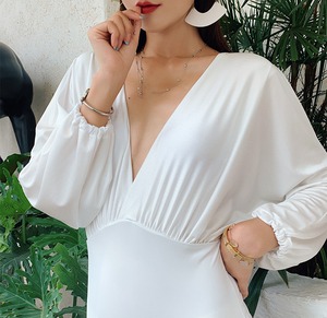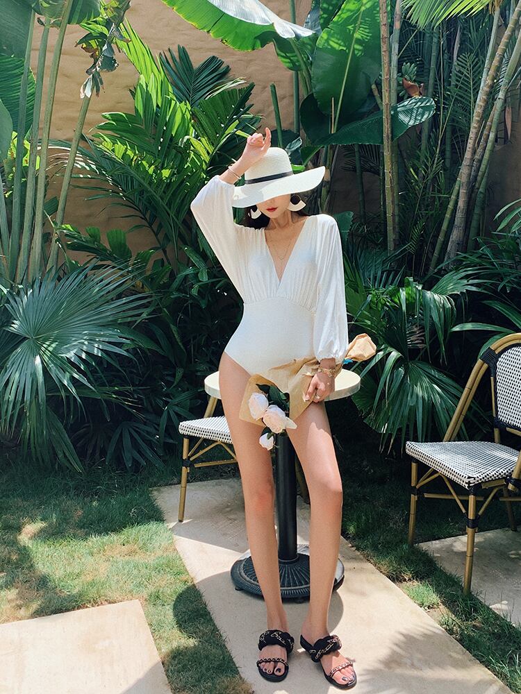 この水着は、深めのVネックが大人っぽい一枚です。ゆったりとした長袖が二の腕や体系のカバーにもなり、美しいスタイルを演出します。