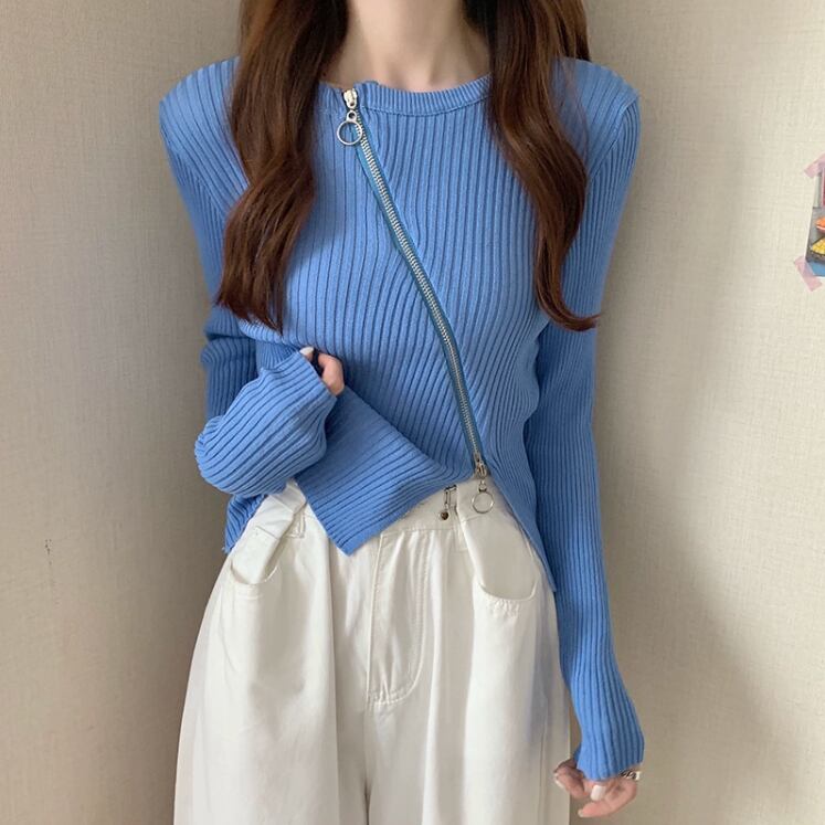 トップス ニットセーター ボトムニットウェア スタイリッシュ 長袖 2WAYファスナー スリムフィット カーディガン 多用途 大人カッコイイ 美スタイル モデルライク スレンダー リブ編み レディース 好印象 スタイルUP 細見え カジュアル お出かけ デート 通勤 通学 学生 OL オフィスコーデ 秋冬 体型カバー 華奢見え ヤセ見え 10代 20代 30代 韓国 スマート見え スッキリ見え サマ見え こなれ感 ワンサイズ ブルー ホワイト ブラック ピンク